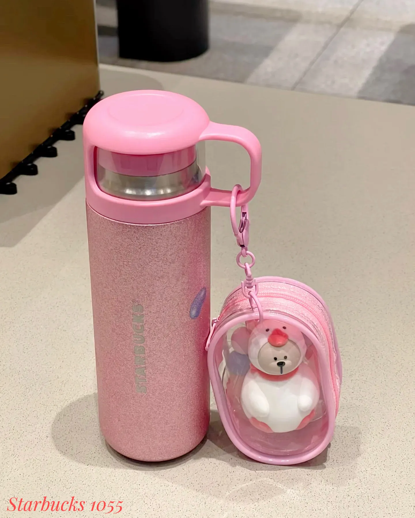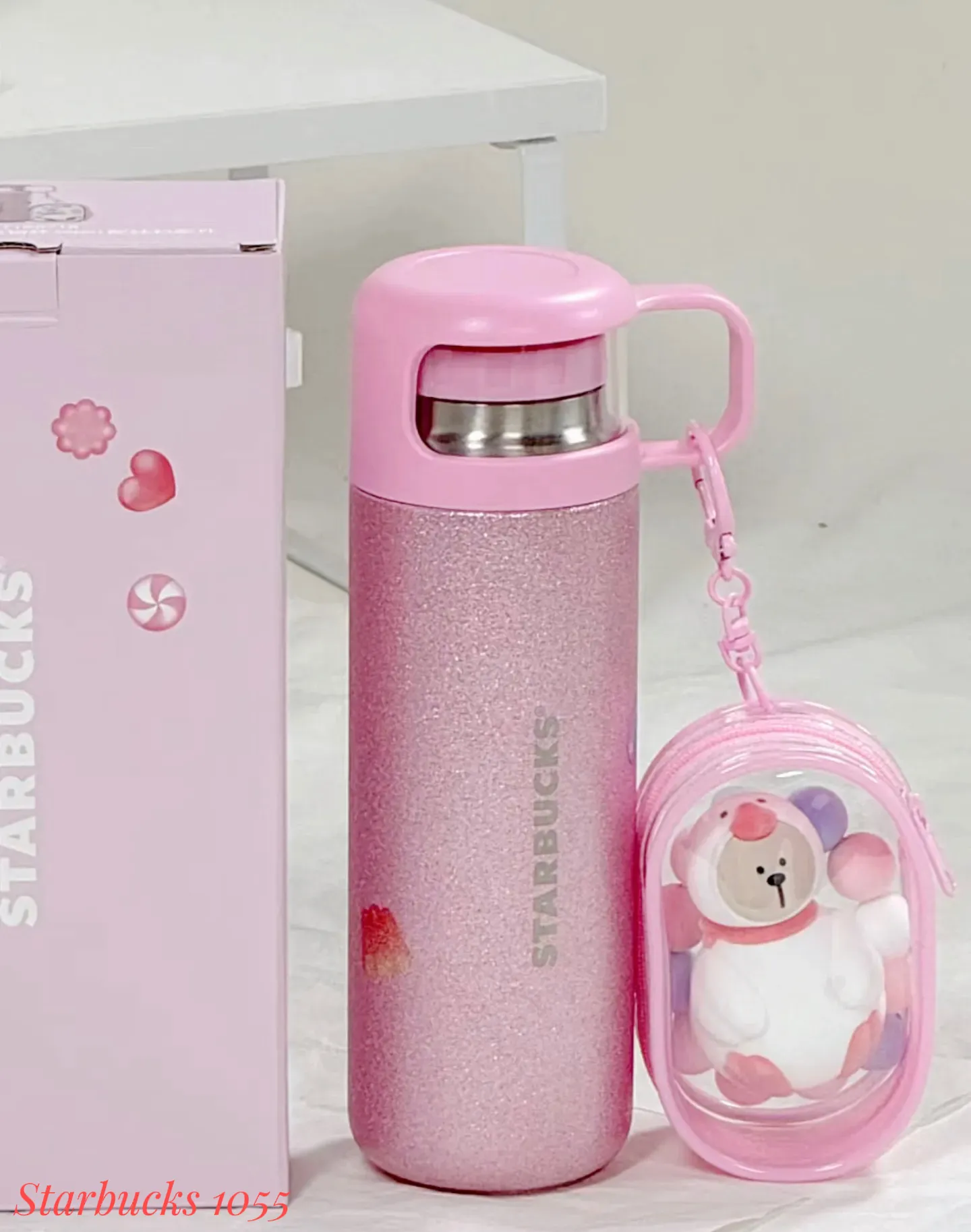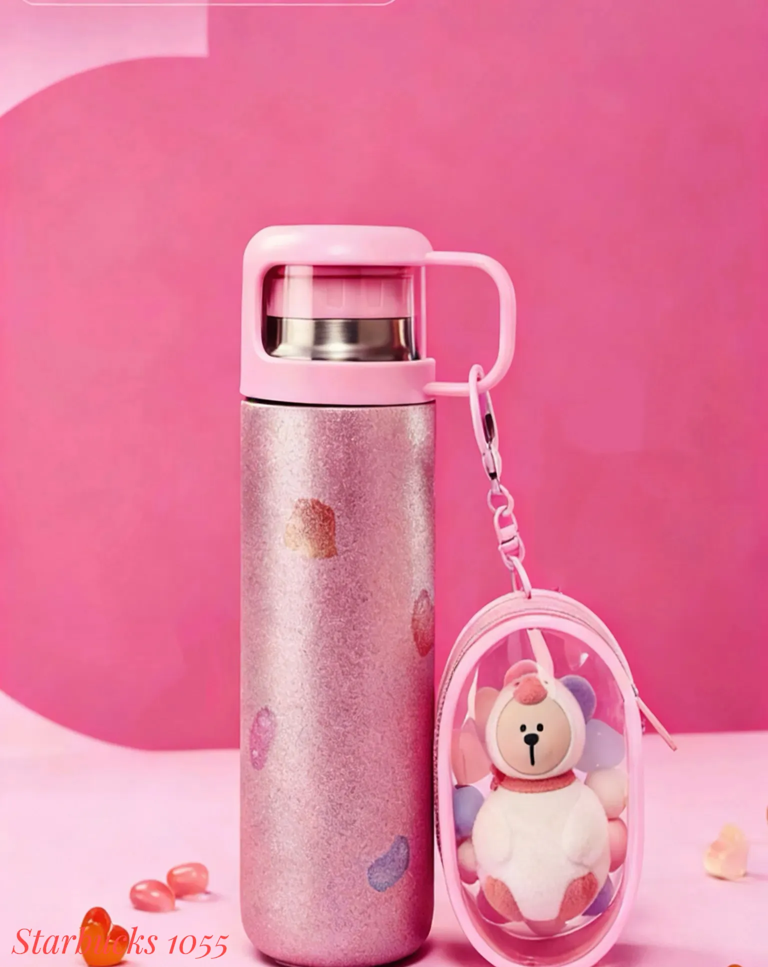 粉色金葱漆面搭配一体式图案,质感升级,挂件噗噗鸭熊店长植绒公仔及娃包(内含糖果型珠串,提升氛围感),杯盖也可做小水杯使用,是你的出行好搭子❤️